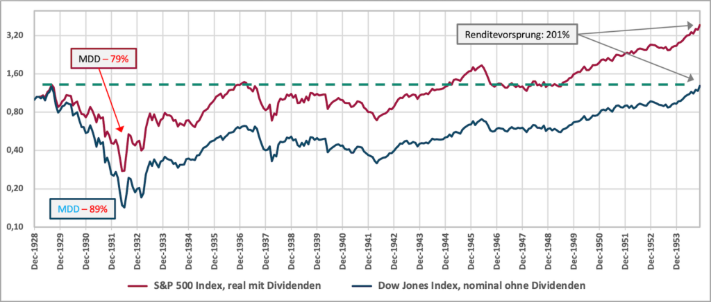 Die folgende Grafik illustriert die Unterschiede beim Kursverlauf von 1928 bis 1954 (26 Jahre) zwischen dem falschen Index und dem richtigen: Der Dow Jones Index ohne Dividenden und nominal versus der S&P 500 Index real (inflationsbereinigt) inklusive Dividenden.
