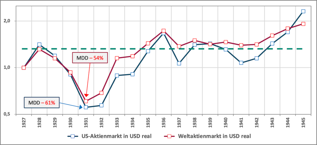 Während der US-Aktienmarkt den Vor-Crash-Stand von Ende 1928 auf der Basis von Jahresdaten erst wieder Ende 1936 erreichte, tat der globale Aktienmarkt das bereits ein Jahr früher, Ende 1935. Ab 1936 bewegte sich der globale Markt renditemäßig bis 1944 über dem US-Markt.