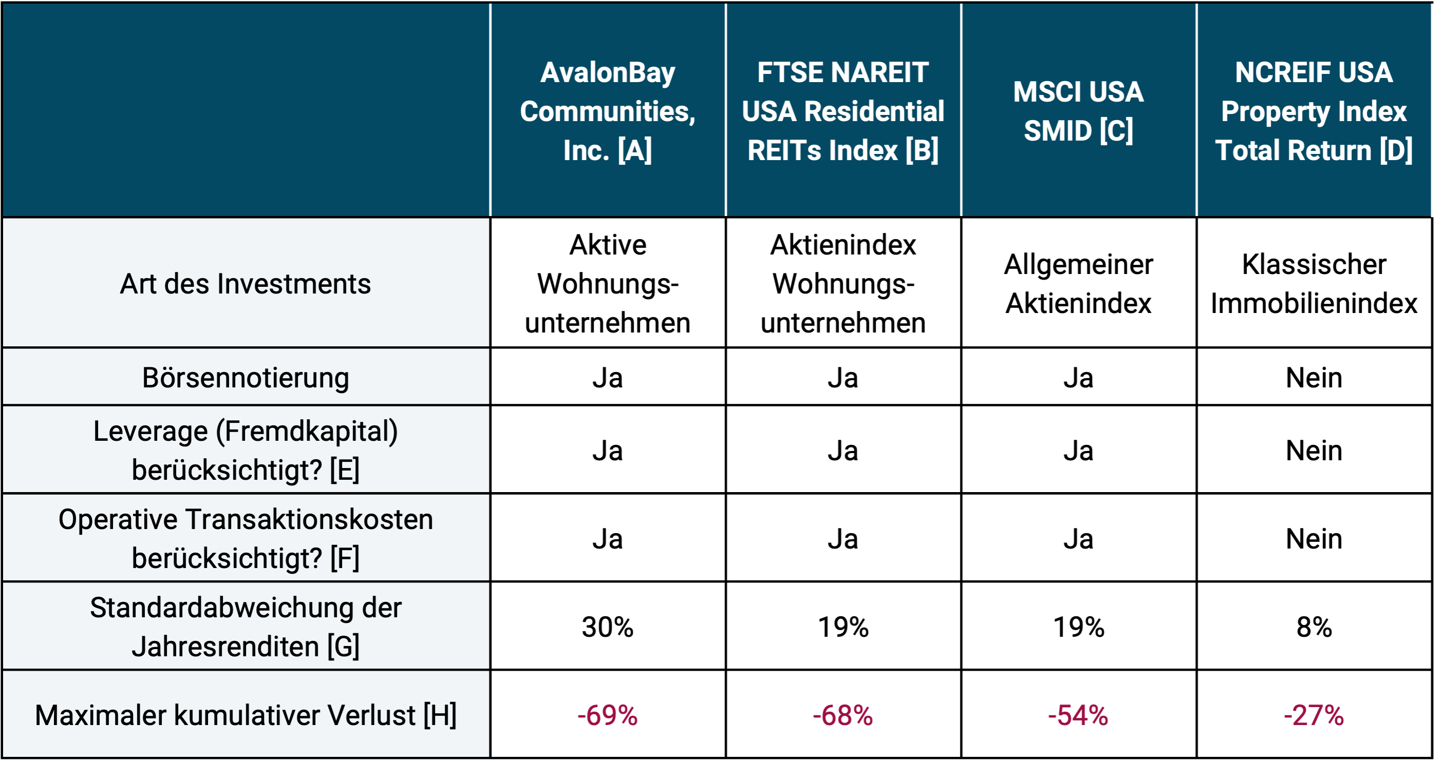 ► Die gezeigten 23 Jahre sind der längste gemeinsam verfügbare Datenzeitraum. ► [A] AvalonBay ist das größte börsennotierte US-Wohnungsvermietungsunternehmen. Es besitzt ca. 77 Tsd. Wohnungen. ► [B] Immobilienaktienindex, der auf Wohnungsvermietung spezialisierte börsennotierte Immobilienunternehmen in den USA abbildet. „REIT“ steht für Real Estate Investment Trust, eine besondere Rechtsform von Immobilienunternehmen. ► [C] Allgemeiner Aktienindex, der Small- und Mid Caps in den USA repräsentiert. Small Caps und Mid Caps wurden deswegen ausgewählt, weil Immobilienunternehmen überwiegend in diesen Größenklassen angesiedelt sind. ► [D] Ein „klassischer“ Immobilienindex, der die Gesamtrenditen (nicht nur Preissteigerungen) von Immobiliendirektanlagen messen soll. Die Objektwerte kommen aus Gutachterbewertungen (sind also keine Marktpreise). Der Index enthält keine Transaktionskosten für den Kauf oder Verkauf der Objekte und keine Fremdkapitalfinanzierungseffekte. All diese Indexstrukturmerkmale senken das ausgewiesene Risiko (die im Index ausgewiesenen Wertschwankungen). ► [E] Teilweise Fremdfinanzierung der Immobilien auf der Ebene des Unternehmens oder des Index enthalten? Ja/nein. Bei Immobilienunternehmen liegt die Fremdkapitalquote durchschnittlich bei 25% bis 50%, also nur geringfügig höher als beim zeitdurchschnittlichen von Privatanlegern finanzierten Objekt. ► [F] Sind die (hohen) Kauf-/Verkaufskosten für Immobilien auf der Ebene des Unternehmens oder des Index in den Renditezahlen enthalten? Ja/nein. ► [G] Standardabweichung der Jahresrenditen (Volatilität): Eine Risikokennzahl zur Messung der Schwankungsintensität der Renditen. ► [H] Der maximale (Buch-)Verlust, den ein Investor im Betrachtungszeitraum hätte erleiden können, wenn er zum jeweils ungünstigstmöglichen Zeitpunkt „ein- und ausgestiegen“ wäre. ► Datenquellen: Yahoo.com, MSCI, NAREIT, NCREIF.