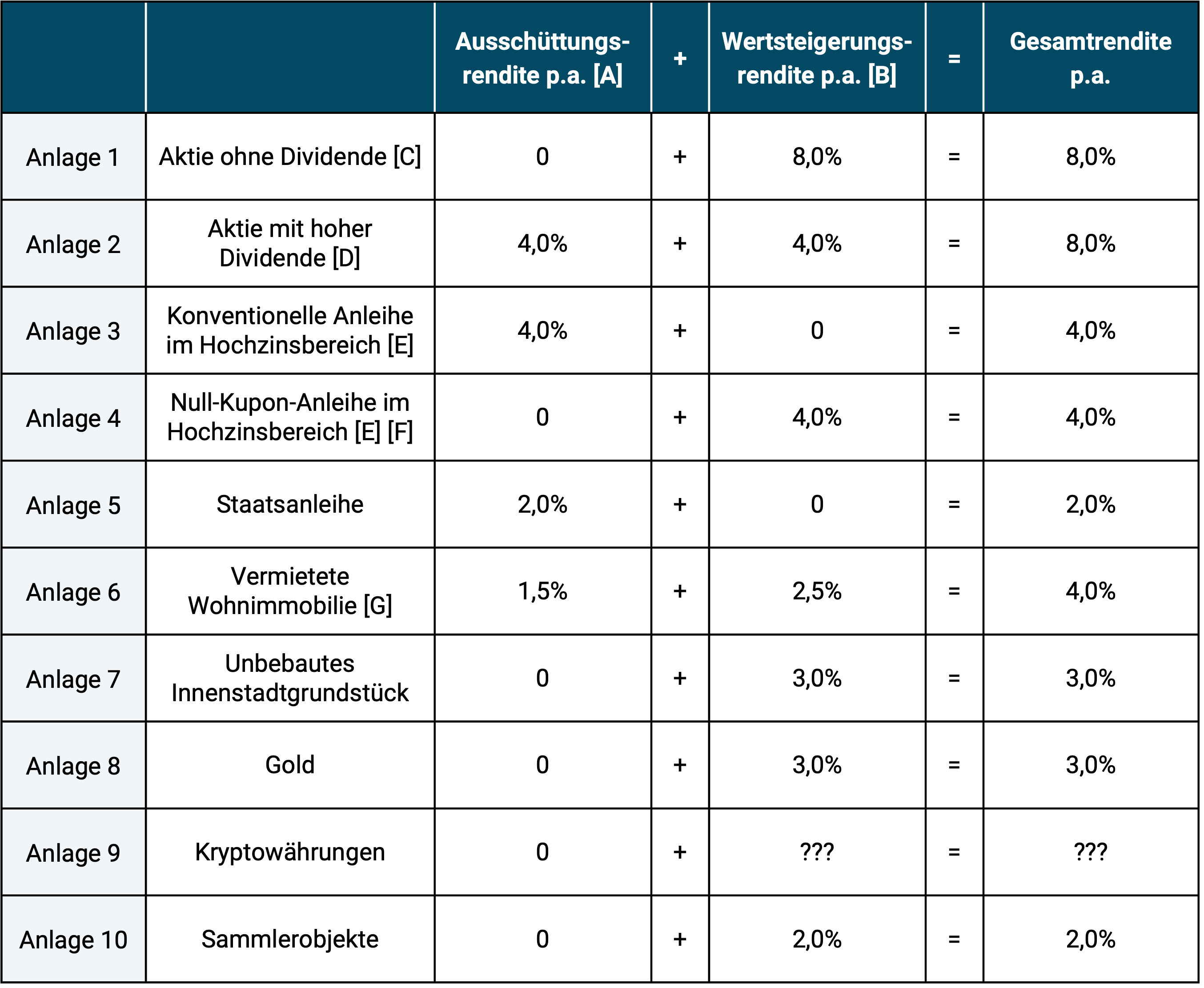 ► [A] Ausschüttungsrendite: Bei einer Aktie ist das die Dividende, bei einer Anleihe die „Kupon-Rendite“, bei einer Immobilie die Nettomietrendite. ► [B] Wertsteigerungsrendite: Bei einer Aktie oder Anleihe sind das die Kurssteigerungen, bei einer Immobilie die Preissteigerungen.► Diese nominalen (nicht inflationsbereinigten) Renditeangaben sind rein fiktiv. ► [C] Beispiel: Die Aktie von Warren Buffet (Berkshire Hathaway Inc.). Sie hat seit über 50 Jahren keine Dividende gezahlt, produzierte dennoch eine weit überdurchschnittliche Gesamtrendite. ► [D] Beispiel: Die Aktie der Münchner Rück hatte in den letzten Jahren eine Dividendenrendite von rund 4% p.a. Weltweit zahlen in einem gegebenen Jahr nur rund 60% aller börsennotierten Unternehmen eine Dividende. Eine Dividendenrendite von über 2 bis 3 Prozent gilt als hoch. ► [E] Bei Anleihen heißt die beim Kauf erwartete Gesamtrendite bis zur Fälligkeit „Umlaufrendite“.► [F] Beispiel: Ein Zero Coupon Bond einer Bank aus Südeuropa. ► [G] Bei Immobilien entspricht die Ausschüttungsrendite der Nettomietrendite. Diese ist die Bruttomietrendite minus Kosten für Instandhaltungskosten und Versicherung.