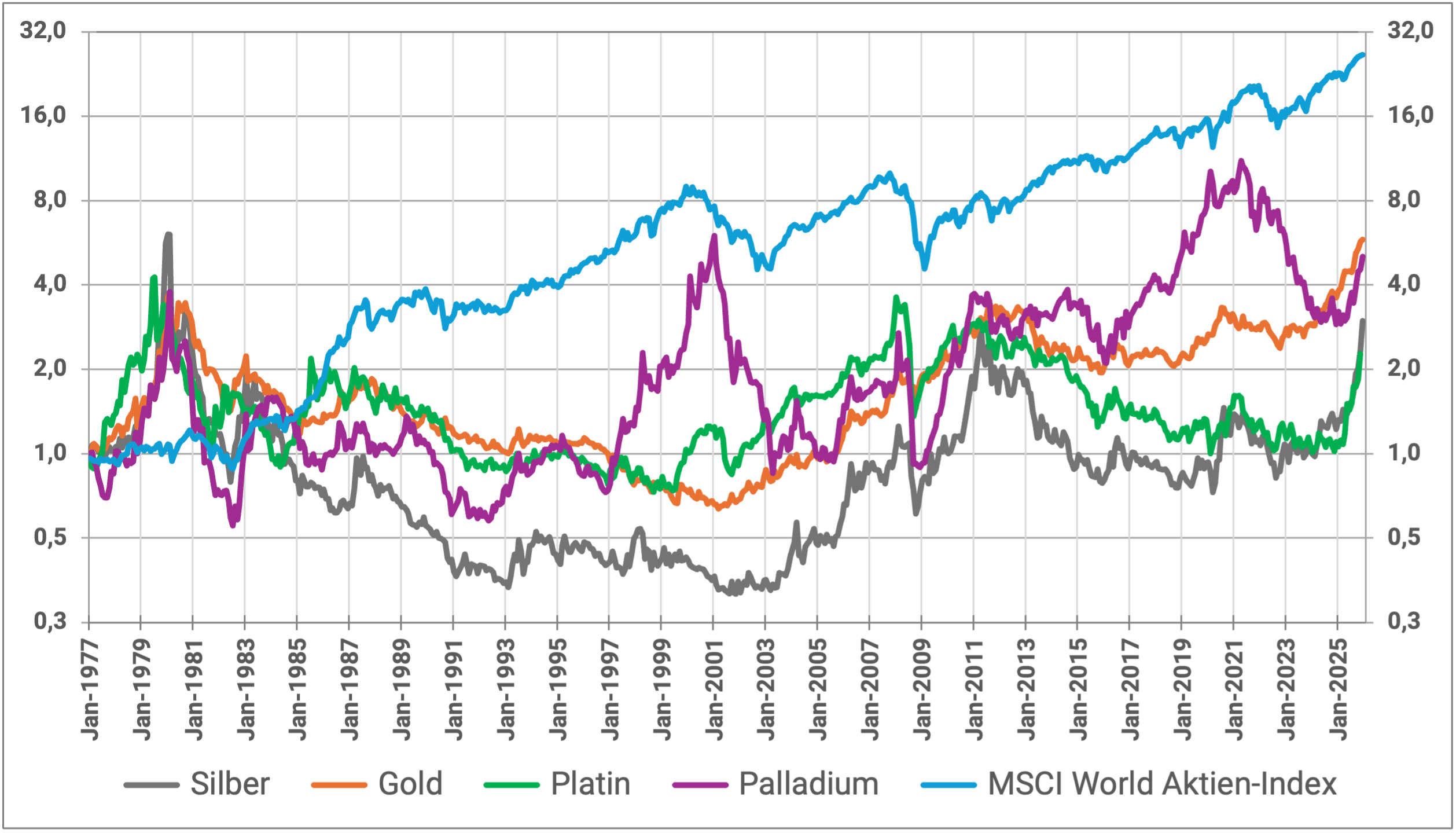 Kommen wir zum Investmentaspekt. Abbildung 1 zeigt die inflationsbereinigten Wertsteigerungen der vier Edelmetalle und des MSCI World-Aktienindex über die 49 Jahre von Anfang 1977 bis Ende 2025. Den Startzeitpunkt 1977 haben wir gewählt, weil monatliche Renditedaten für Palladium erst ab diesem Zeitpunkt verfügbar sind. Aber auch für Gold könnte eine historische Investmentanalyse nicht viel weiter zurückgehen als 1977. Renditedaten von Gold vor 1975 sind letztlich nicht aussagekräftig, da erst Ende 1974 das jahrzehntelange Goldverbot [2] in den USA aufgehoben wurde und noch weitere Jahre später erst in China und Indien sowie anderen für die globale Goldnachfrage maßgeblichen Staaten. (Bis Ende 1971 war der Goldpreis in US-Dollar vom amerikanischen Staat im Kontext des so genannten Bretton-Woods-Währungssystems staatlich vorgegeben, woraus sich eine Rendite in Dollar von nahe null ergab.)