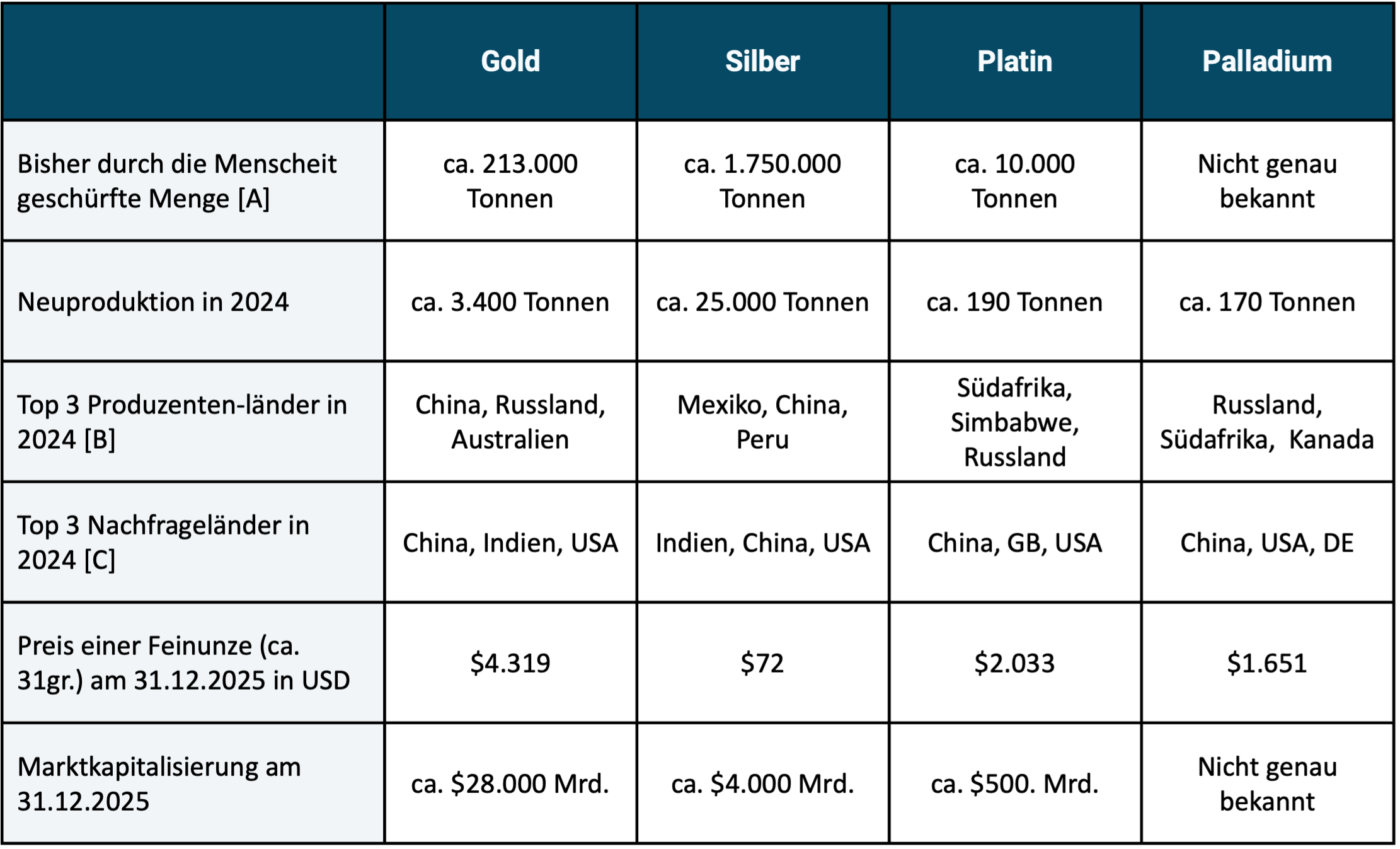 Tabelle 1: Ausgewählte realwirtschaftliche Schlüsseldaten zu vier Edelmetallen