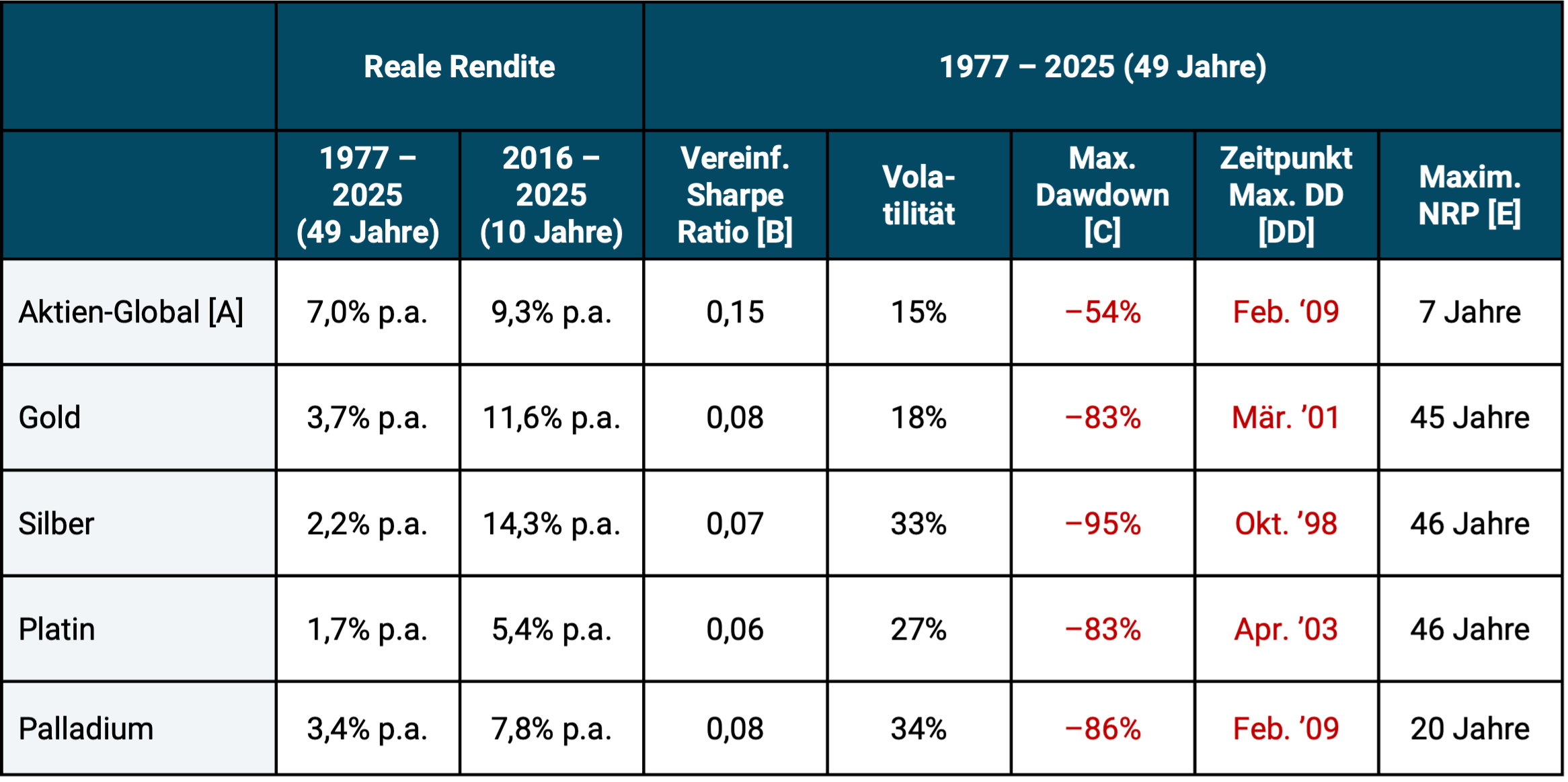 Die in Tabelle 2 aufgeführten Zeiträume für die Edelmetalle zur Maximalen Nullrenditeperiode mögen manchem Betrachter schockierend lang erscheinen. Die Zahlen sind jedoch korrekt. Der Grund für die hohen MNRP-Werte, liegt in der Inflationsadjustierung der Renditen in Kombination mit der hohen Volatilität von Edelmetallrenditen. Greifen wir zur Erläuterung beispielhaft Gold heraus: Gold hatte im Januar 1980 ein Allzeithoch von 850 USD pro Unze, was in heutigem Geld (Geldwert von Ende 2025), also „aufinflationiert“ etwa 3.500 Dollar entspricht. Diesen Preis überschritt Gold jedoch tatsächlich erst wieder im August 2024 nach 45 quälend langen Jahren. So ähnlich verhielt es sich mit den anderen drei Edelmetallen. Nur Palladium schneidet hier mit einer Maximalen Nullrenditeperiode von „nur“ 20 Jahren merklich besser ab (1980 bis 2000).