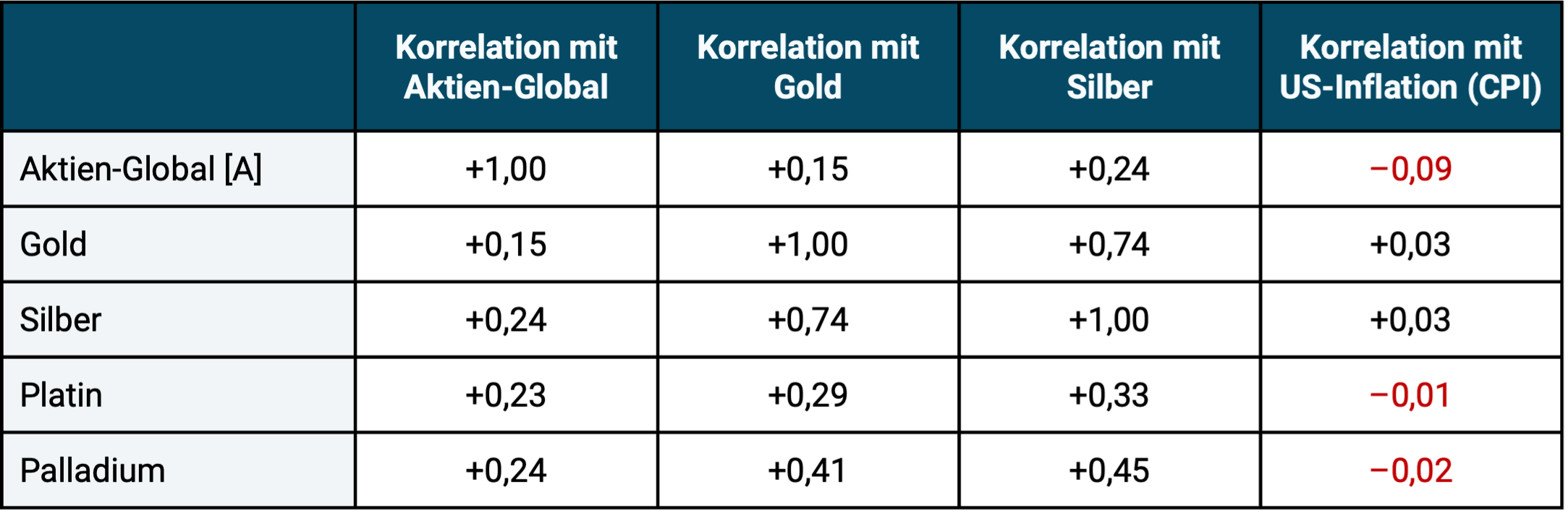 Platin und Palladium korrelieren relativ moderat mit Gold und mit Silber. Palladium erscheint daher geeignet, das Risiko (Volatilität) von Gold zu diversifizieren (niedrige Korrelation bei annähernd gleich hoher Langfristrendite). Platin zeigt eine noch geringere Korrelation zu Gold bei jedoch schwacher historischer Rendite.