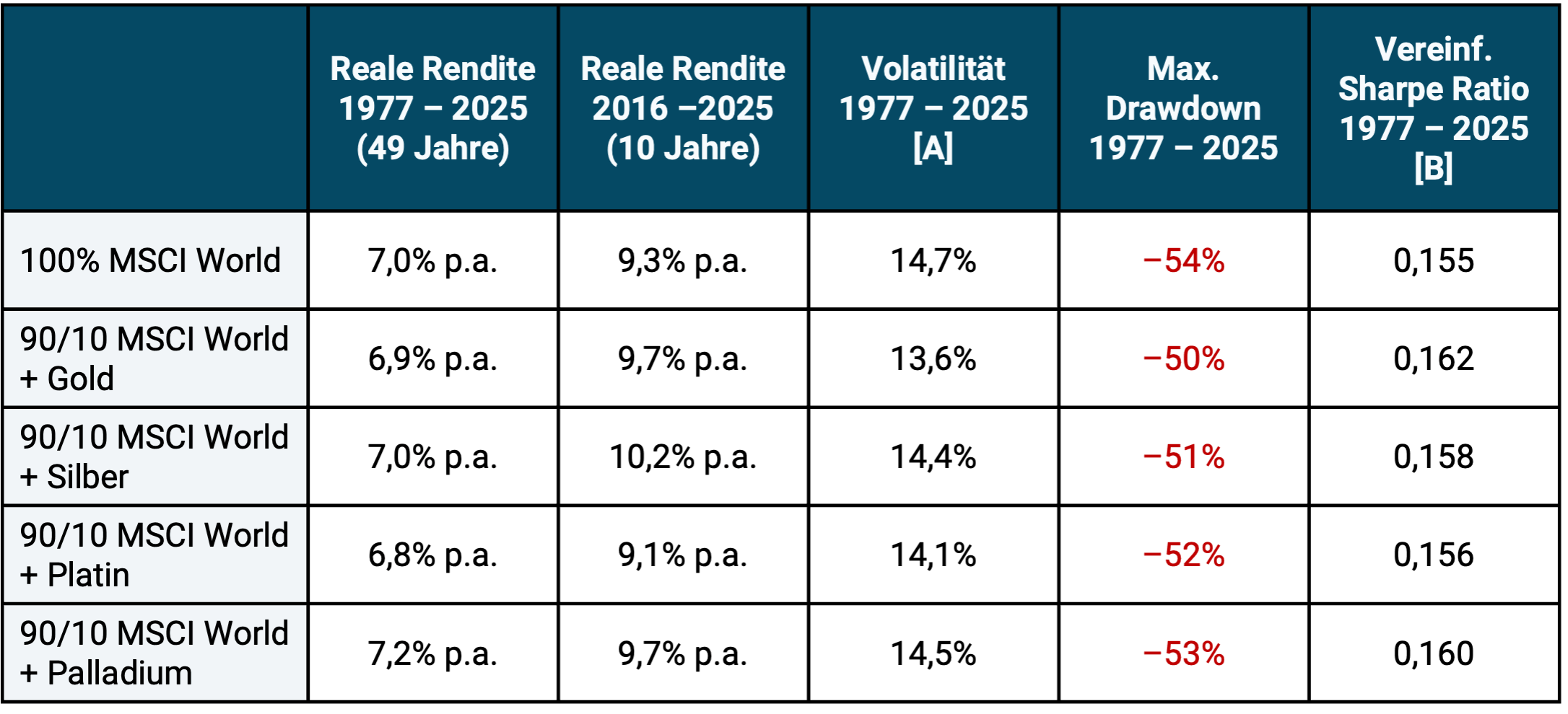 Neben der reinen Korrelationsanalyse betrachteten wir noch die sieben Perioden zwischen 1977 und 2025, in denen der MSCI World Index einen inflationsbereinigten Drawdown von 20% oder mehr erlitt [5] und prüften, welches der vier Edelmetalle in diesen sieben Aktienmarkteinbrüchen insgesamt die beste Aktien-Hedge war, also geringer einbrach als der Aktienmarkt oder eventuell sogar positive Renditen hatte. Auch bei diesem hier nicht gesondert anhand von Zahlen gezeigten Diversifikationstest schnitt Gold unter den vier Metallen am besten ab.