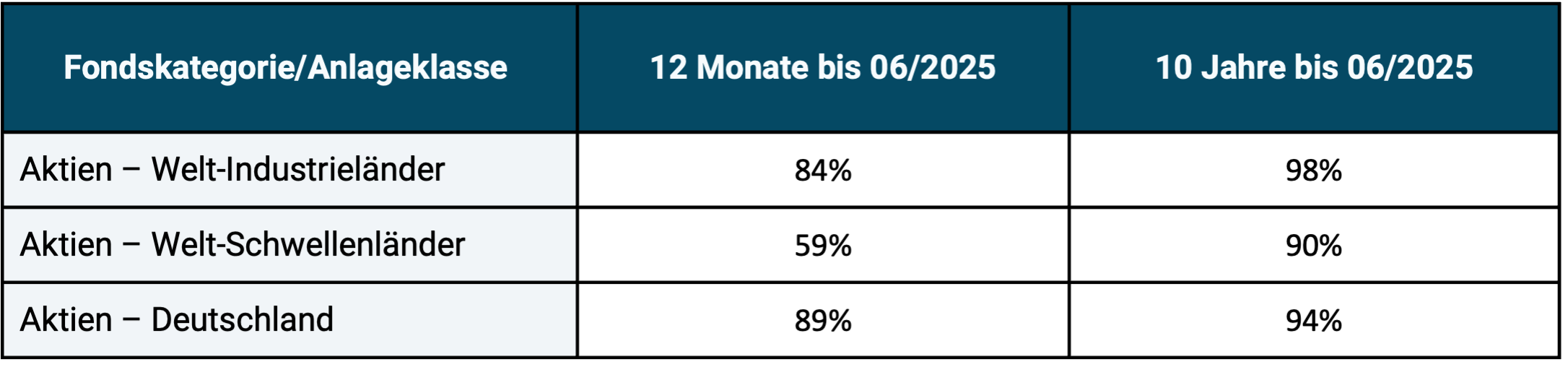 ► Quelle: S&P Dow Jones Indices „SPIVA Europe Scorecard Mid Year 2025“ (Equal Weighted Funds). ► Renditen in Euro. ► Ohne Berücksichtigung von Kosten in der Benchmark, aber auch ohne Kosten für etwaige Ausgabeaufschläge der aktiv gemanagten Fonds. ► Originaldaten auf ganze Zahlen gerundet.