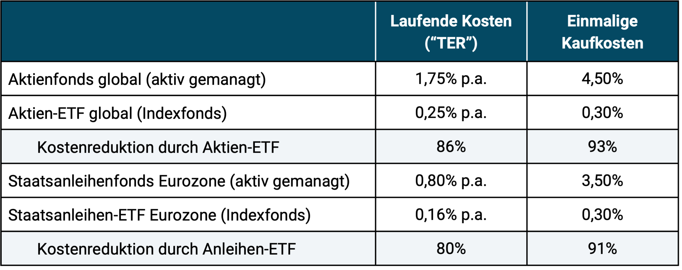 Tabelle 1: Vergleich typischer Kosten zwischen aktiv gemanagten Investmentfonds und Indexfonds (ETFs) in Deutschland und Österreich