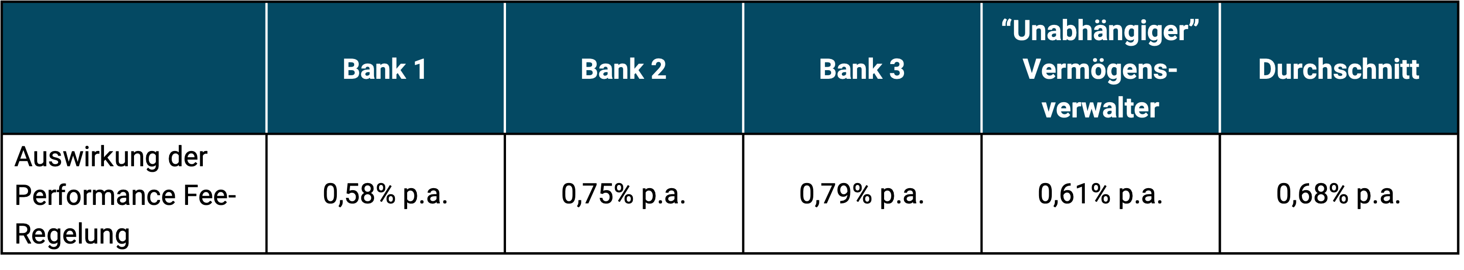 Tabelle 2: Quantifizierung von Performance Fees verschiedener Anbieter in Form einer langfristigen durchschnittlichen Kostenquote
