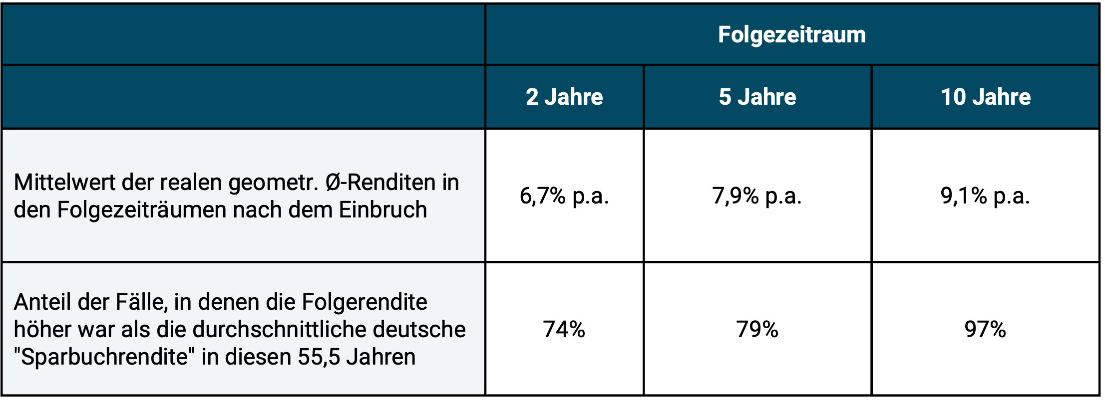 In Tabelle 3 führen wir eine nochmal etwas andere Analyse für den globalen Aktienmarkt im kürzeren Zeitraum von 1970 bis Juni 2025 (55,5 Jahre) durch. In diesen fünfeinhalb Jahrzehnten produzierte der Weltaktienmarkt eine reale Rendite von durchschnittlich 5,4% p.a. (in DM bzw. Euro). In der Tabelle betrachten wir, was in den Folgezeiträumen nach einem realen Einbruch (Drawdown) von mindestens 25% passiert ist.