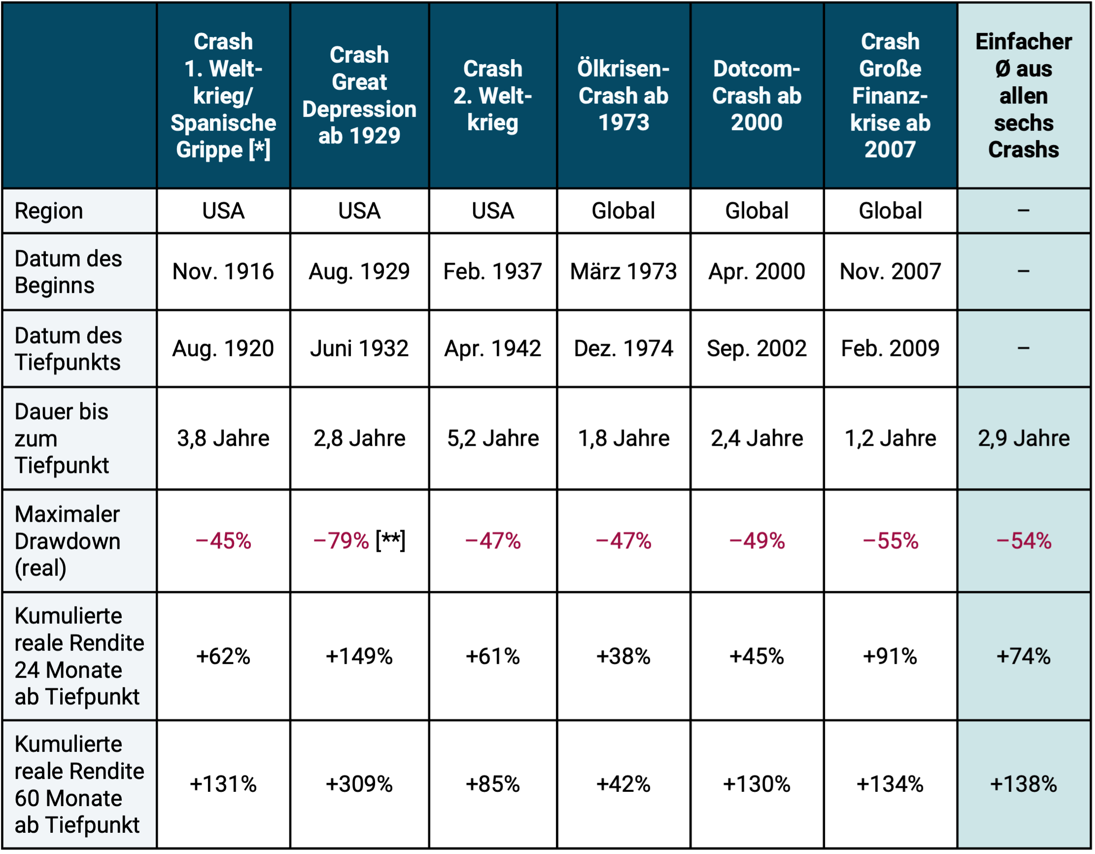 ► In USD, inflationsbereinigt, ohne Kosten und Steuern. ► USA-Aktienmarkt in USD von 1900 bis 1969 (S&P Composite Index 1900–1926, CRSP 1–10 Index 1927–1969), da vor 1970 keine Renditen auf Monatsbasis für den Weltaktienmarkt verfügbar sind. 1970 bis 1987 MSCI World Standard Index, 1988 bis 1995 MSCI ACWI Standard Index, ab 1996 MSCI ACWI IMI Index. ► [*] Pandemie Spanische Grippe: Sie dauerte von Februar 1918 und April 1920. Schätzungen zufolge starben an ihr zwischen 1% und 5% der damaligen Weltbevölkerung. ► [**] Der hier dargestellte Maximale Drawdown für den Great-Depression-Crash auf Basis der US-Aktienmarktdaten ist eine Überzeichnung/Übertreibung (siehe Erläuterungen im laufenden Text weiter unten).