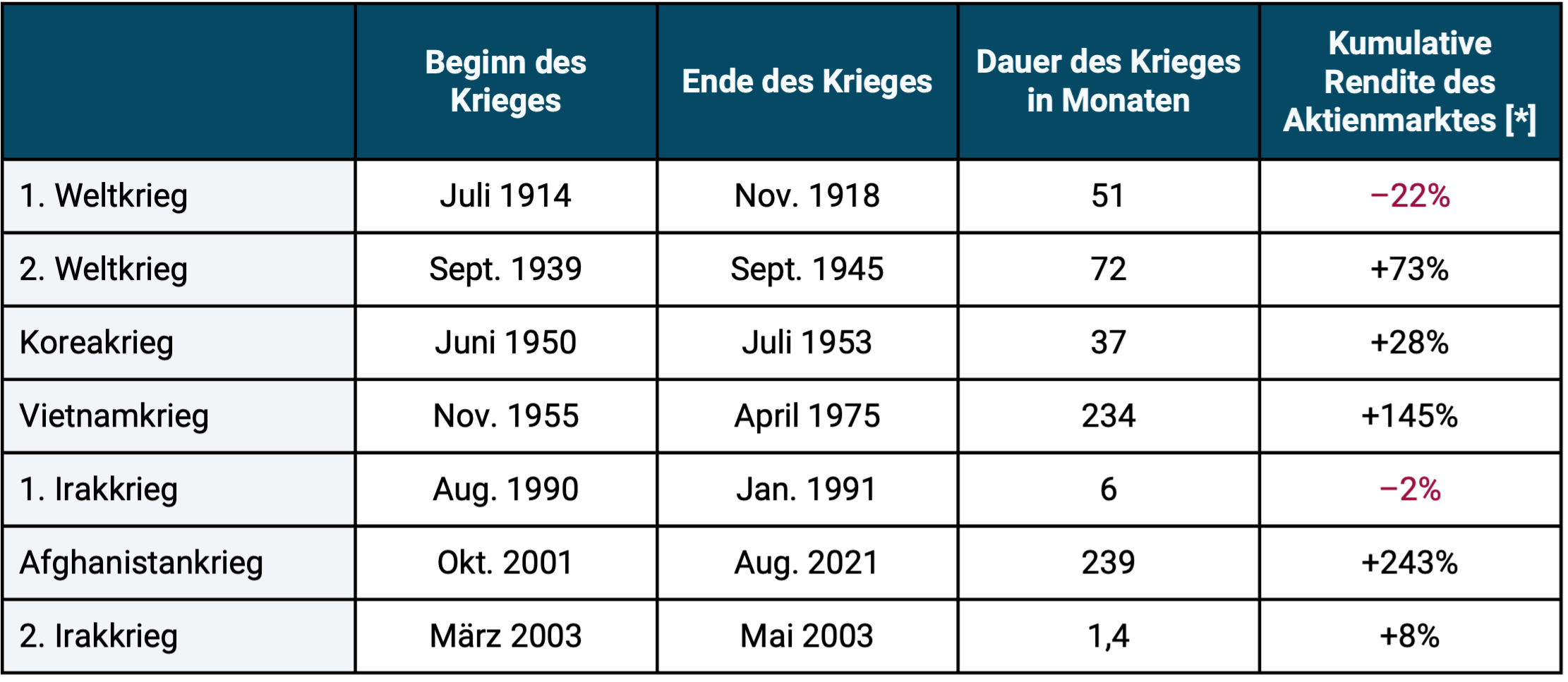 Mit Ausnahme des Ersten Weltkrieges gab es am globalen Aktienmarkt über die Gesamtdauer bei keinem dieser furchtbaren Konflikte eine nennenswert negative Rendite. Dauerte der Konflikt länger als wenige Monate, stiegen die Kurse am Weltaktienmarkt bis zum Ende des Krieges zweistellig oder dreistellig. Bei den besonders lange andauernden Kriegen, wie dem Vietnamkrieg und dem Afghanistankrieg, zeigt sich, dass auch diese den langfristigen Aufwärtstrend des globalen Aktienmarktes nicht aufhalten.