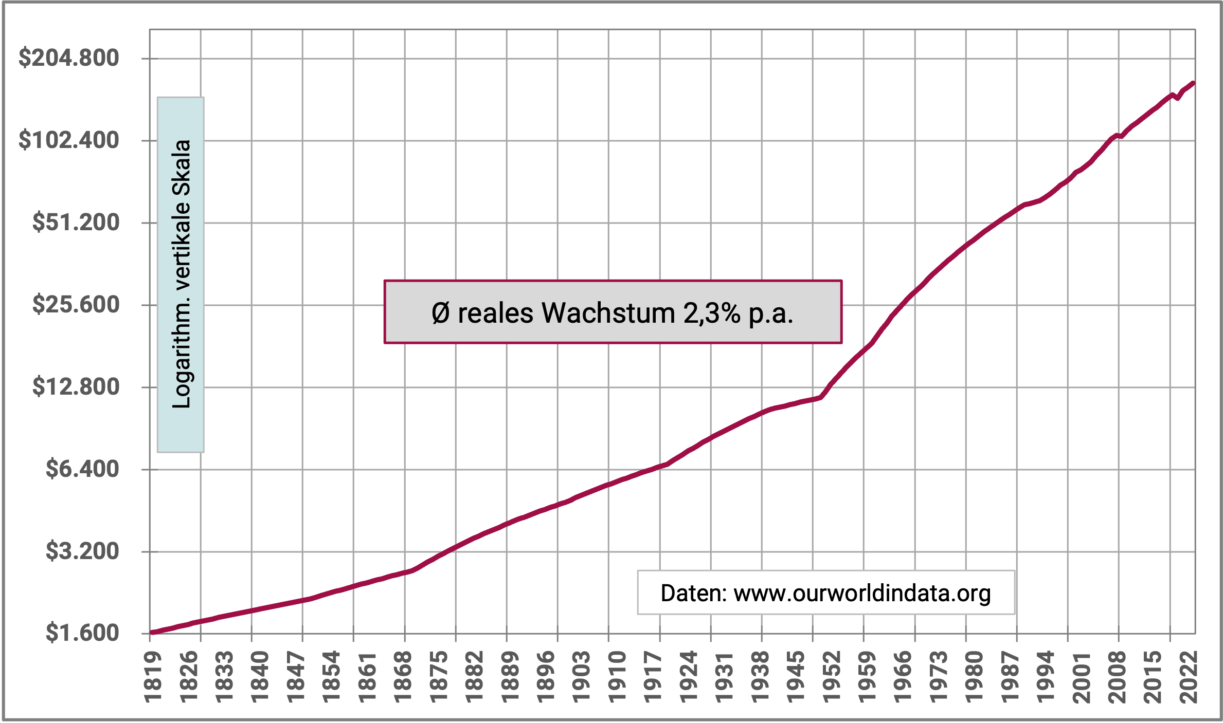 Abb. 1: Das Wachstum des globalen Bruttoinlandproduktes in Billionen US-Dollar von 1820 bis 2023 (204 Jahre) – inflationsbereinigt (in USD von 2022)