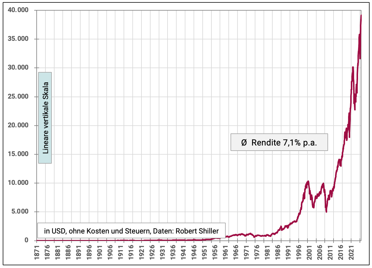 Abb. 2: Indexierte Entwicklung des US-Aktienmarkts von 01-1871 bis 10-2025 (154,8 Jahre), inflationsbereinigt – lineare vertikale Skala