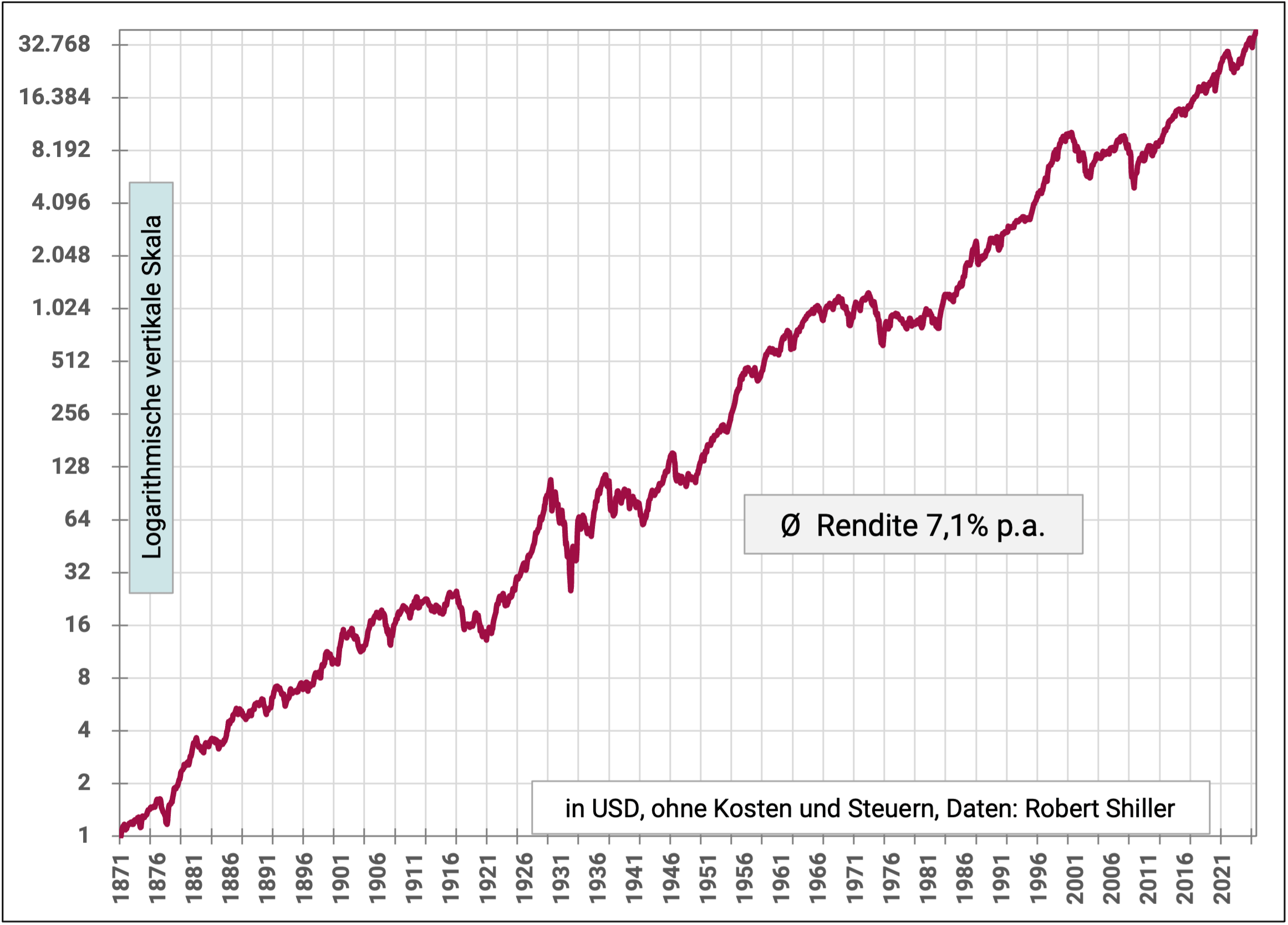 Abb. 3: Indexierte Entwicklung des US-Aktienmarkts von 01-1871 bis 10-2025 (154,8 Jahre), inflationsbereinigt – logarithmische vertikale Skala