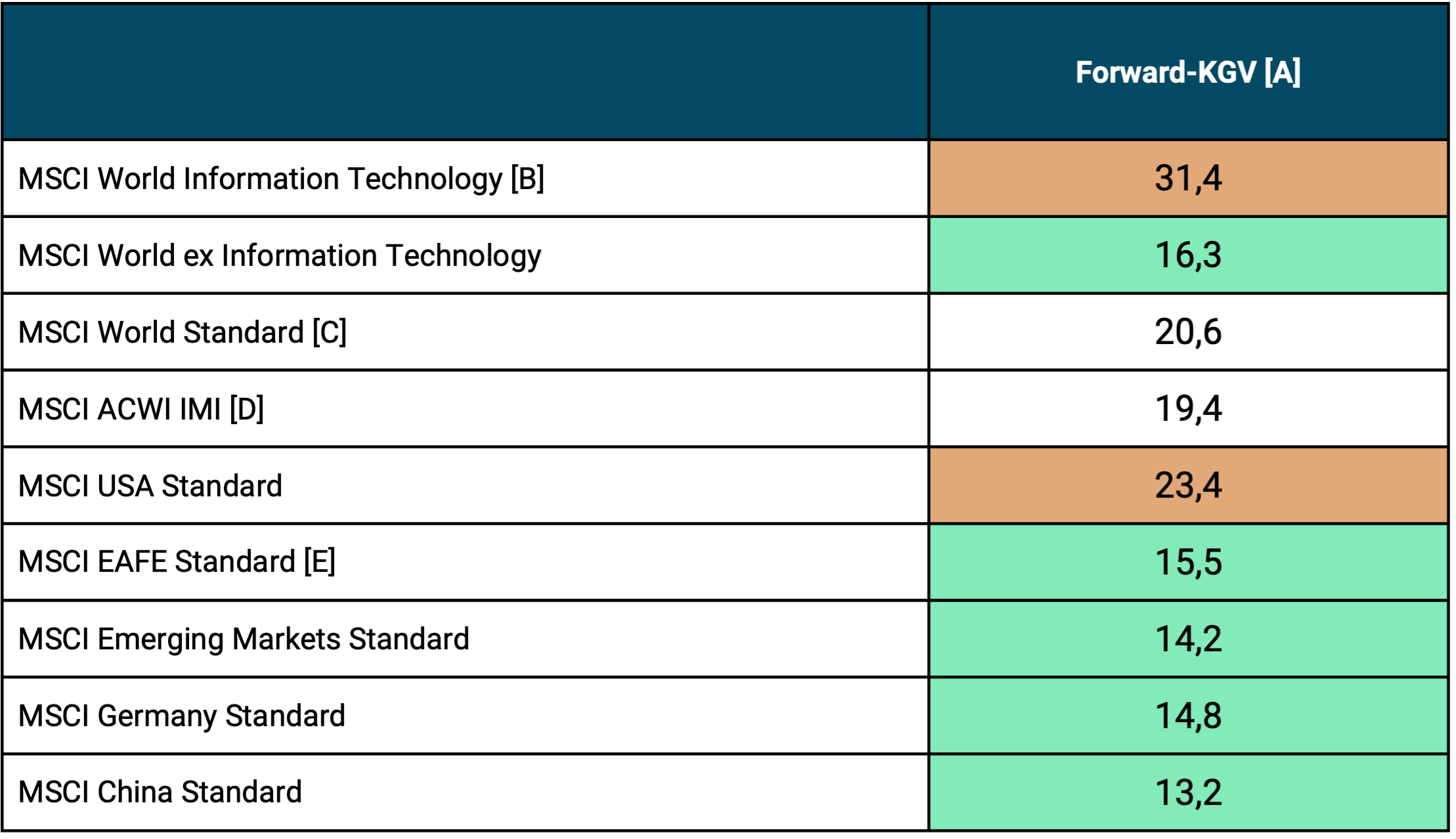 ► [A] KGV = Kurs-Gewinn-Verhältnis, eine Bewertungskennzahl. Der KGV-Variante „Forward-KGV“ liegt nicht der historische Gewinn aus den letzten 12 Monaten zugrunde, sondern der prognostizierte Gewinn für die kommenden 12 Monate. Forward-KGVs sind aus unserer Sicht tendenziell aussagekräftiger als konventionelle, historische „Trailing“-KGVs. Die Trailing-KGVs wären für alle hier gezeigten Indizes höher. ► [B] „Tech-Aktien-Sektor“. ► [C] Der MSCI World Index besteht aktuell zu 73% aus US-Aktien und zu 29% aus Tech-Sektor-Aktien. ► [D] ACWI IMI = All Country World Index IMI = Industrieländer + Schwellenländer inkl. Nebenwerte = 99% der Marktkapitalisierung des Weltaktienmarktes. ► [E] EAFE = MSCI World ex USA und Kanada (EAFE = Europe, Asia, Far East). ► Quelle: MSCI Index Fact Sheets.