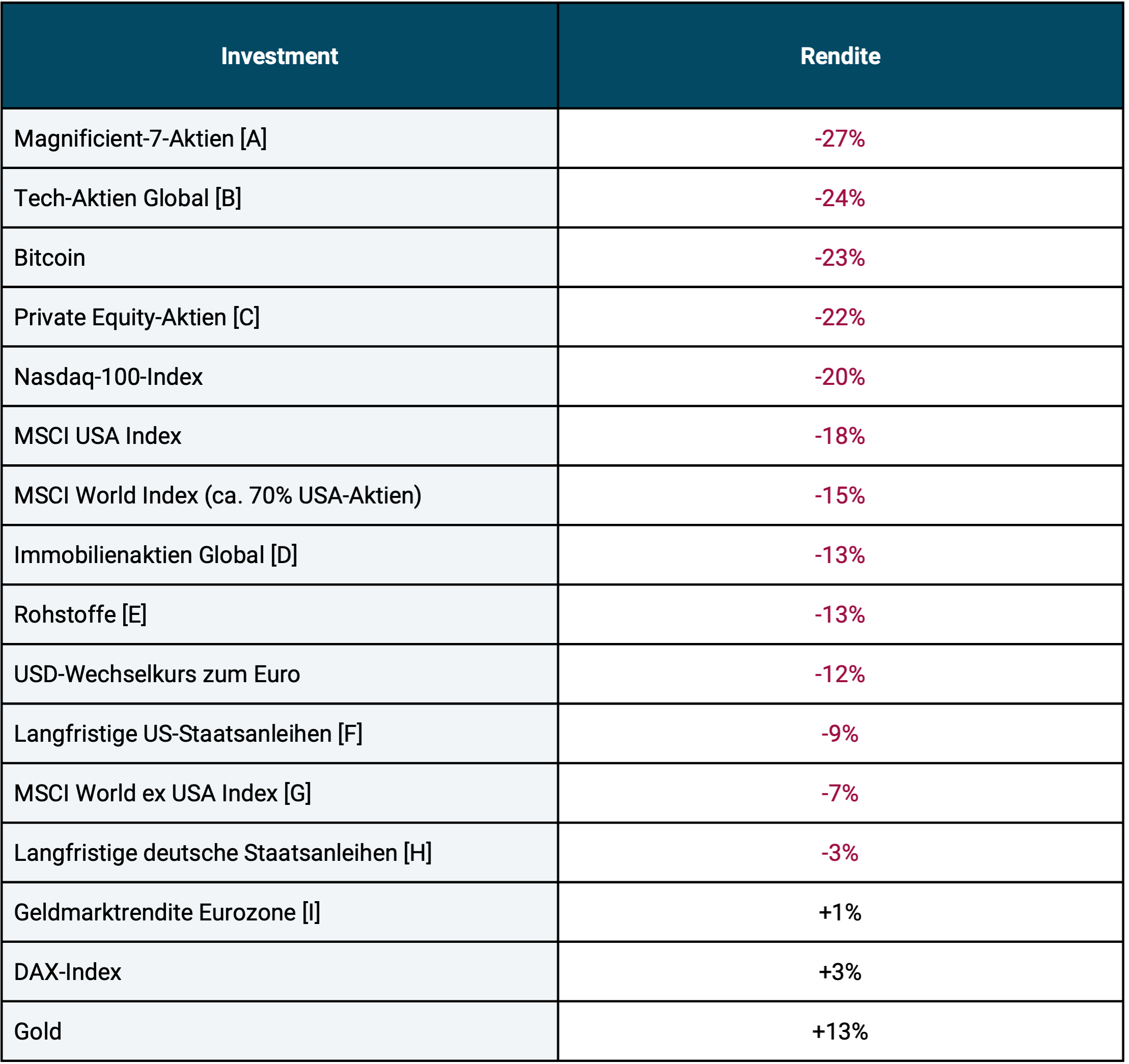 Tabelle 1: Renditen ausgewählter Anlageklassen und Einzelinvestments vom 01.01.2025 bis 11.04.2025 (100 Tage) – in Euro