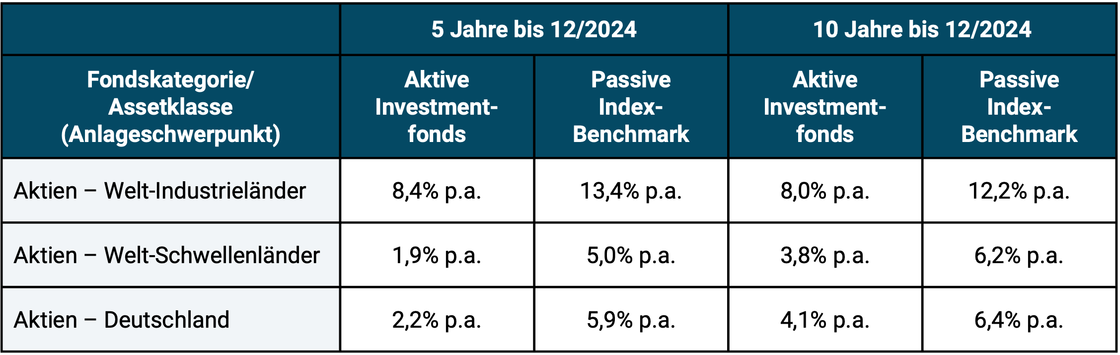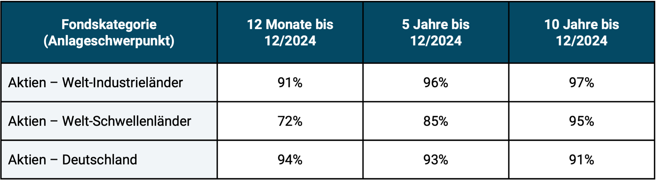 ► Quelle: S&P Dow Jones Indices „SPIVA Europe Scorecard Year End 2024“. ► Originaldaten auf ganze Zahlen gerundet. ► Ohne Berücksichtigung von Kosten in der passiven Benchmark, aber auch ohne Kosten für etwaige Ausgabeaufschläge der aktiv gemanagten Fonds. Indexfonds/ETFs sind in der zugrunde liegenden Datengesamtheit nicht enthalten. Rechtlich handelt es sich bei allen Fonds um UCITS-Fonds (Publikumsfonds).