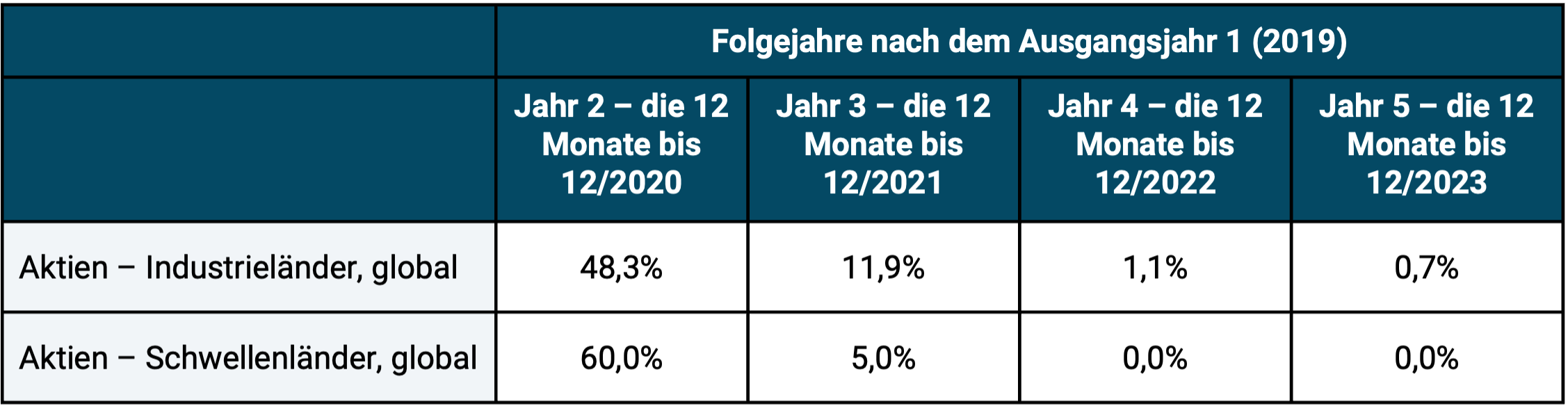 Zur Interpretation der Daten in Tabelle 4: In den zwei Zeilen der Tabelle wird der Prozentsatz derjenigen aktiven Fonds gezeigt, die im Ausgangsjahr 2019 (Jahr 1) das Top-Quartil aller Fonds für die betreffende Anlageklasse bildeten (die 25% aller Fonds mit der höchsten Rendite im Jahr 2019) und die danach ununterbrochen weiterhin im Top-Quartil lagen. Im auf das Ausgangsjahr 2019 (Jahr 1) anschließende Jahr 2020 wird der Prozentsatz der Fonds genannt, die in Jahr 1 und Jahr 2 zum Top-Quartil gehörten, im Jahr 3 die Fonds, die ununterbrochen in allen drei Jahren im Top-Quartil blieben etc. Der Anteil dieser „kontinuierlichen Gewinnerfonds“ nimmt von Jahr zu Jahr ab.