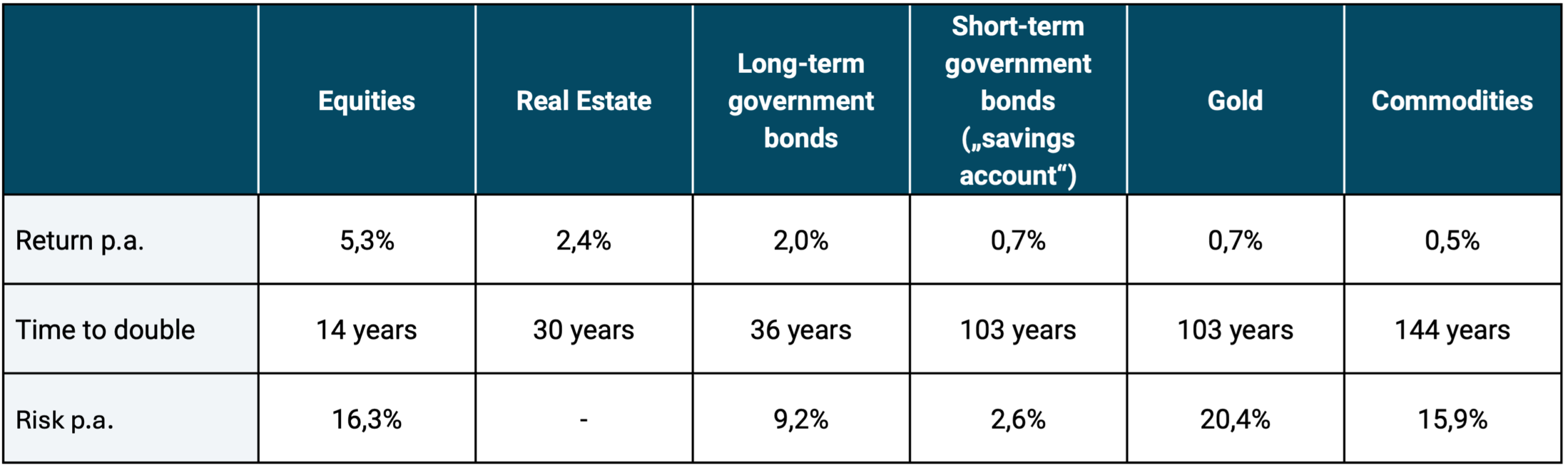 Table: 1: Inflation-adjusted long-term returns of the most important asset classes (in USD) from 1900 to 2021 (122 years)