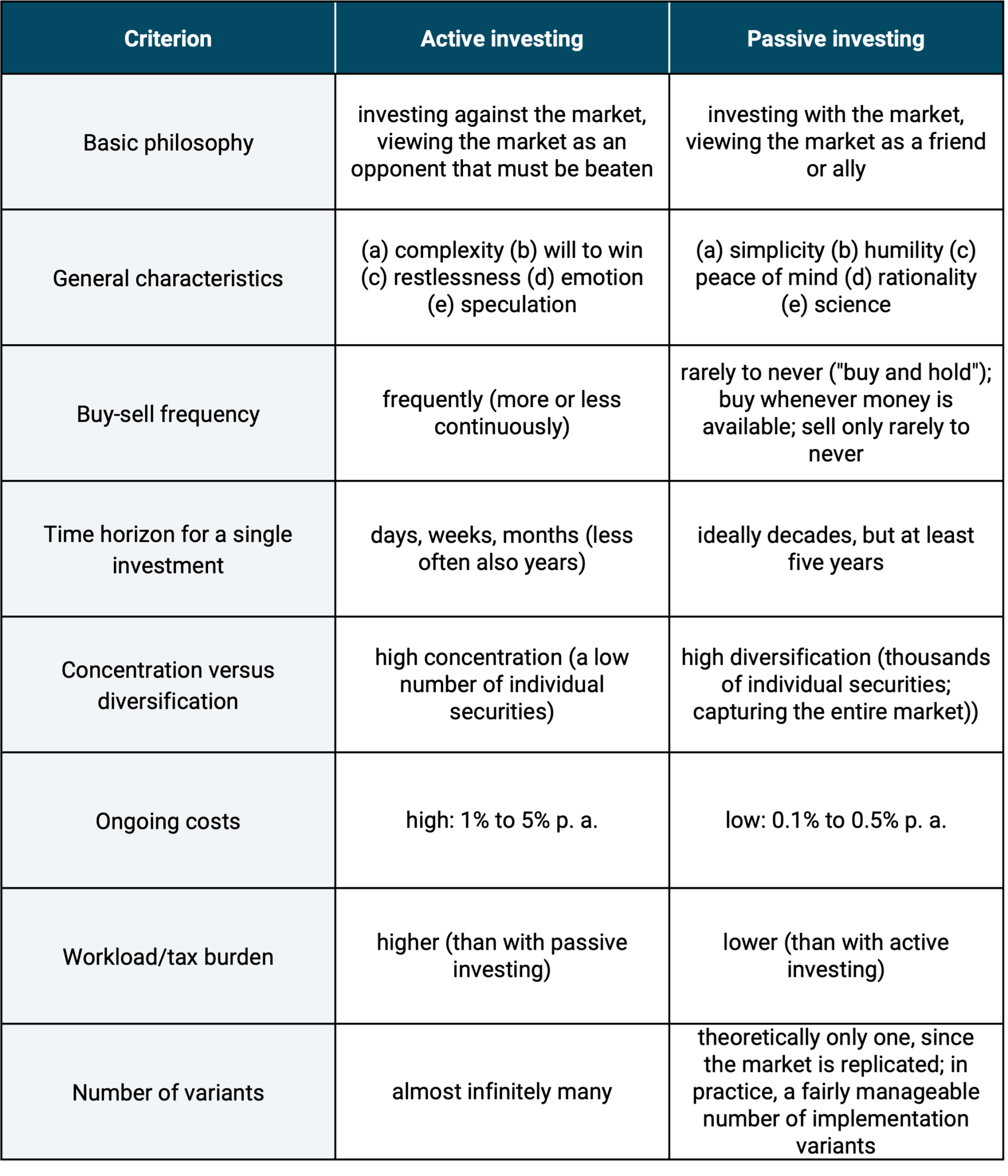 For all those who may have lost track of all the metaphors in the meantime, we have conjured up Table 2, which explains the differences between active and passive investing in a somewhat drier and more concise form: