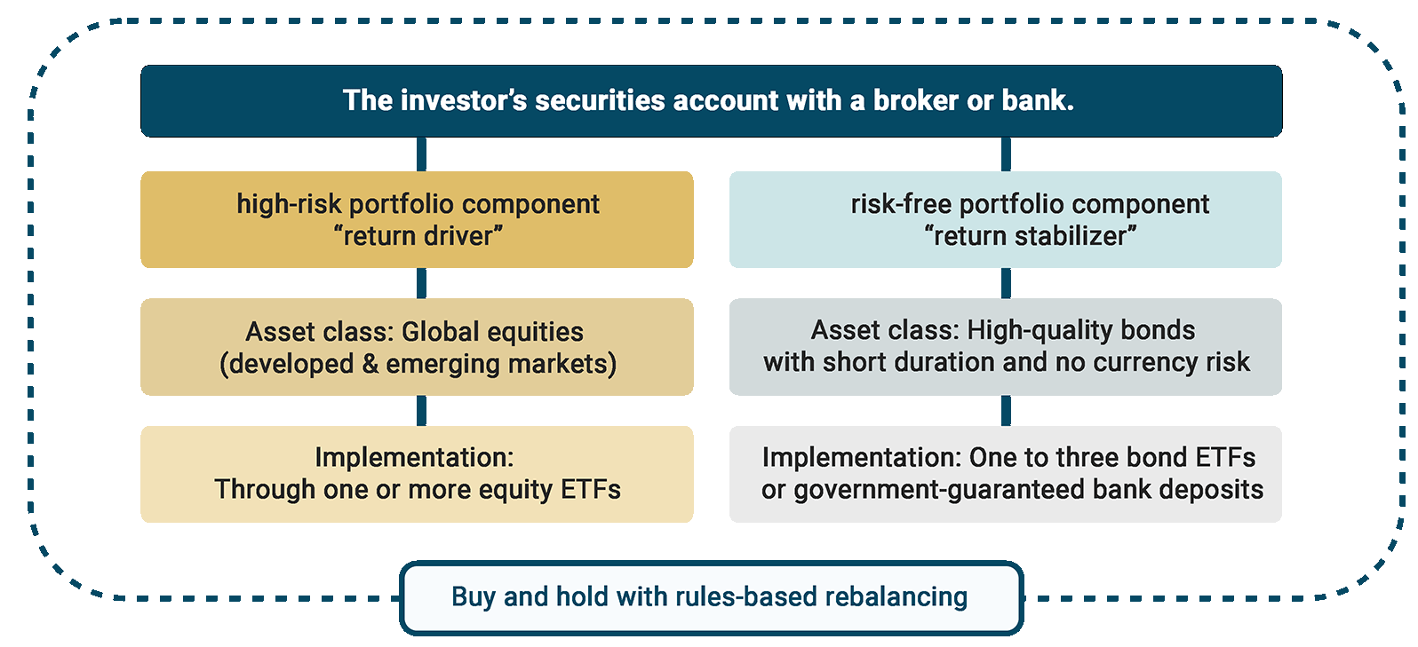 This is Dr. Gerd Kommer’s world portfolio concept derived from science. In the simplest case, one ETF product is sufficient for the risky part of the portfolio and one for the low-risk part. We have illustrated this in the following graphic.