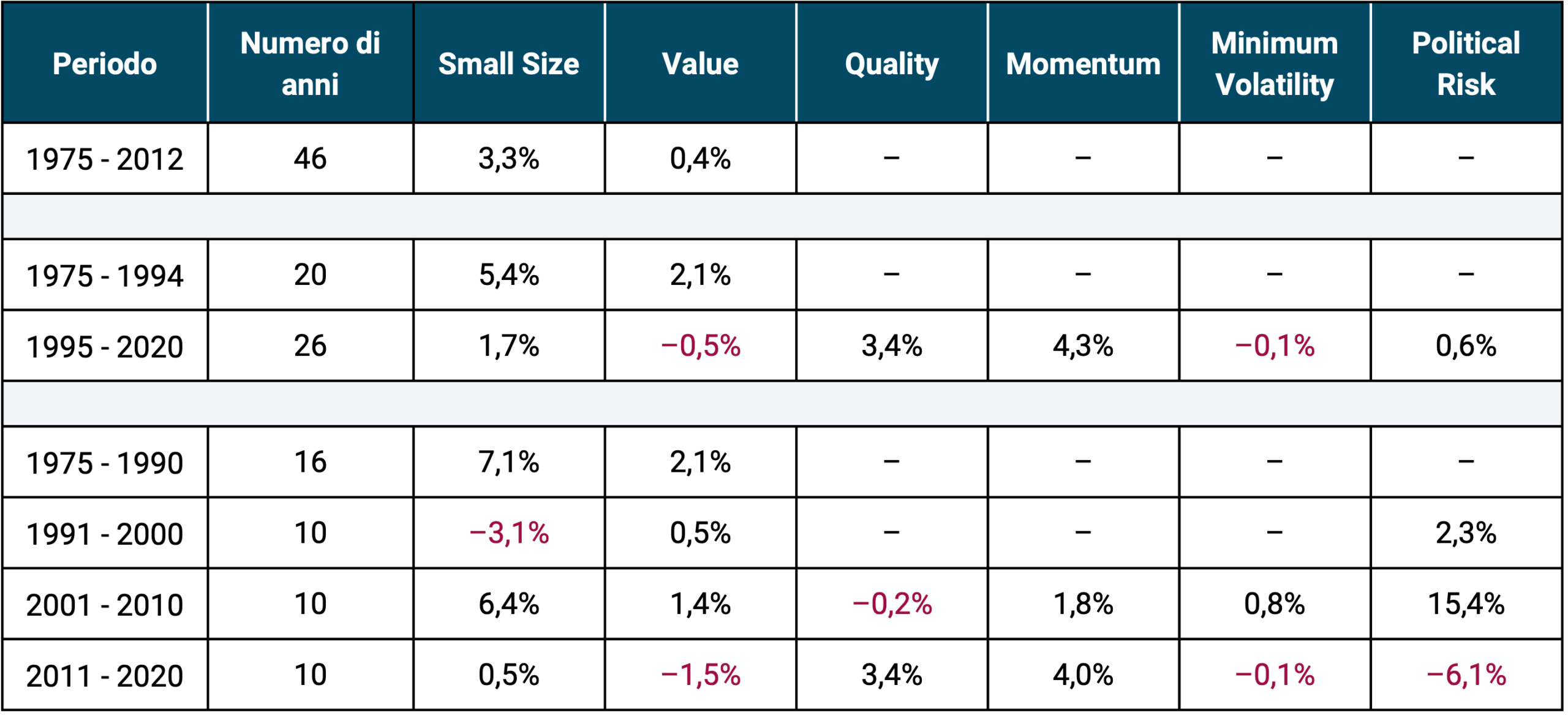 Tabella: Panoramica dell’entità dei diversi premi di fattore annuali dal 1975 al 2020 (46 anni) e dei periodi parziali in questi 46 anni per il mercato globale (“premi long-only”)