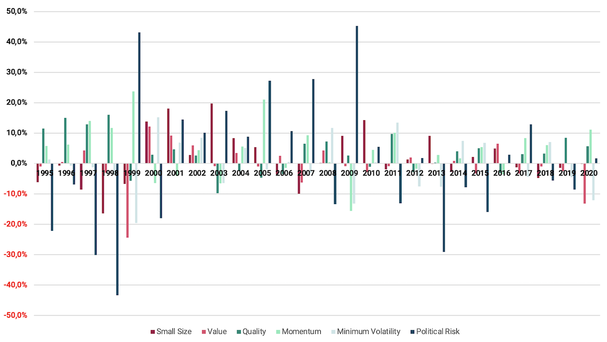 La figura seguente illustra graficamente questo potenziale di fluttuazione. Il grafico mostra le realizzazioni annuali dei cinque premi di fattore sopra menzionati nel periodo dal 1995 al 2020. L’asse verticale corrisponde all’importo percentuale dei premi in un determinato anno, mentre l’asse orizzontale rappresenta il trascorrere del tempo.