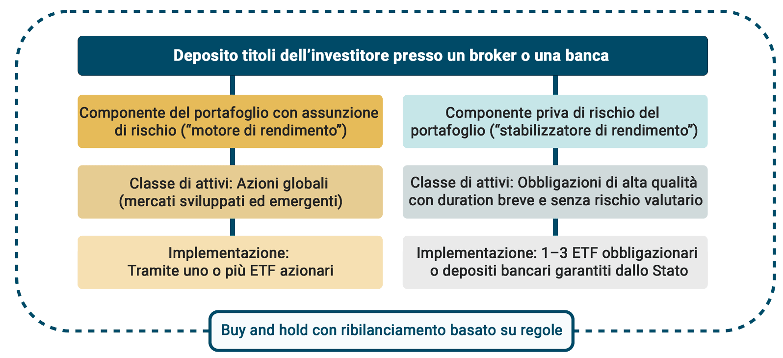 nel caso più semplice, un portafoglio globale può essere realizzato con un ETF per la parte di portafoglio a rischio e uno per la parte a basso rischio. Per un investitore che desidera un’allocazione livello 1 100/0 o che desidera utilizzare il conto corrente nell’ambito della garanzia sui depositi statale per la quota di portafoglio priva di rischi, è sufficiente un solo ETF.