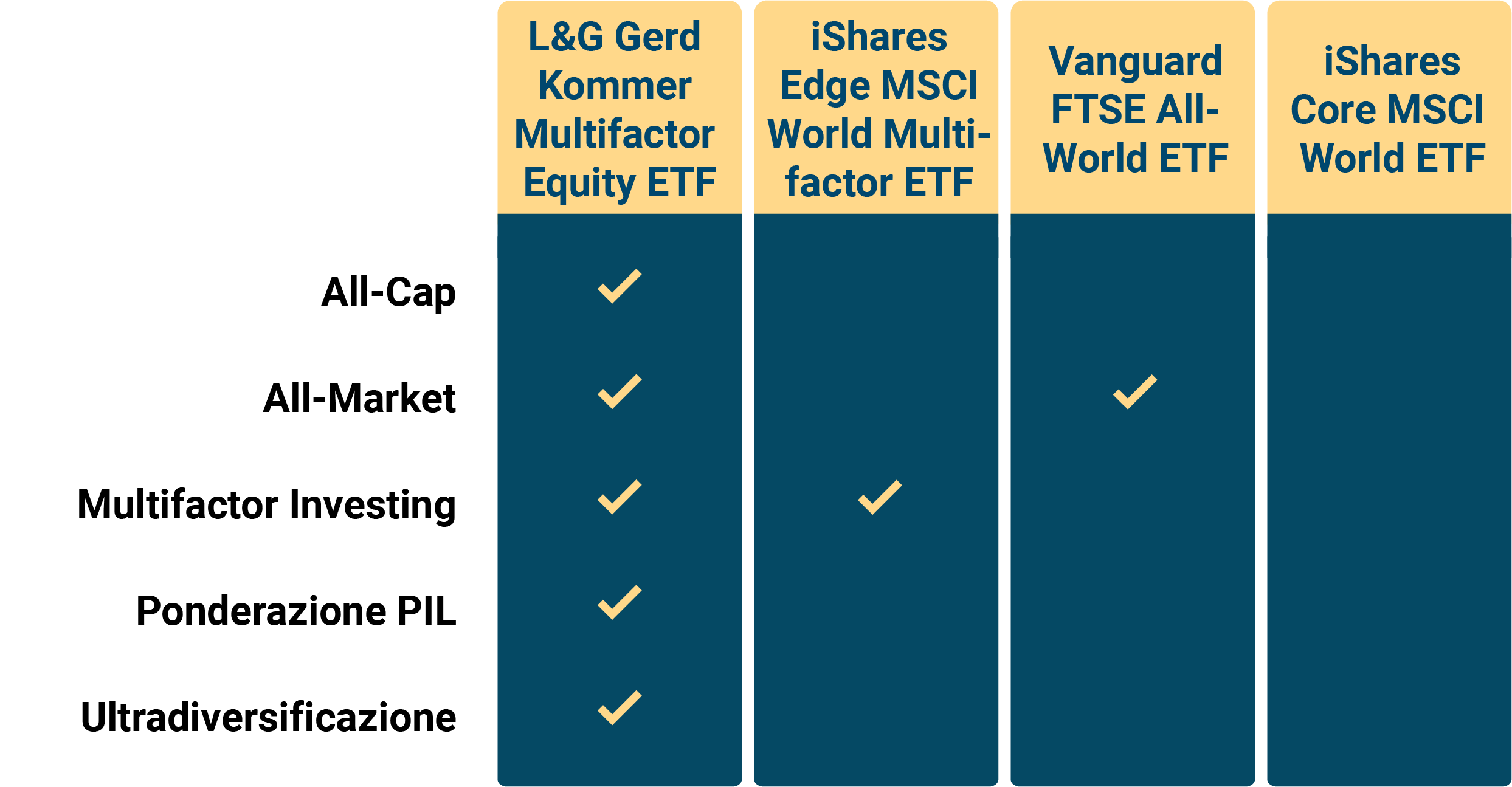 L’L&G Gerd Kommer Multifactor Equity ETF è unico nel suo genere: Un ETF All-Cap- e un All World ETF che tiene conto sia della capitalizzazione del mercato che della performance economica (“PIL”) nella ponderazione dei paesi, sovraponderando i premi di fattore (Factor Investing) e offrendo un’ultradiversificazione con oltre 4.000 azioni singole.