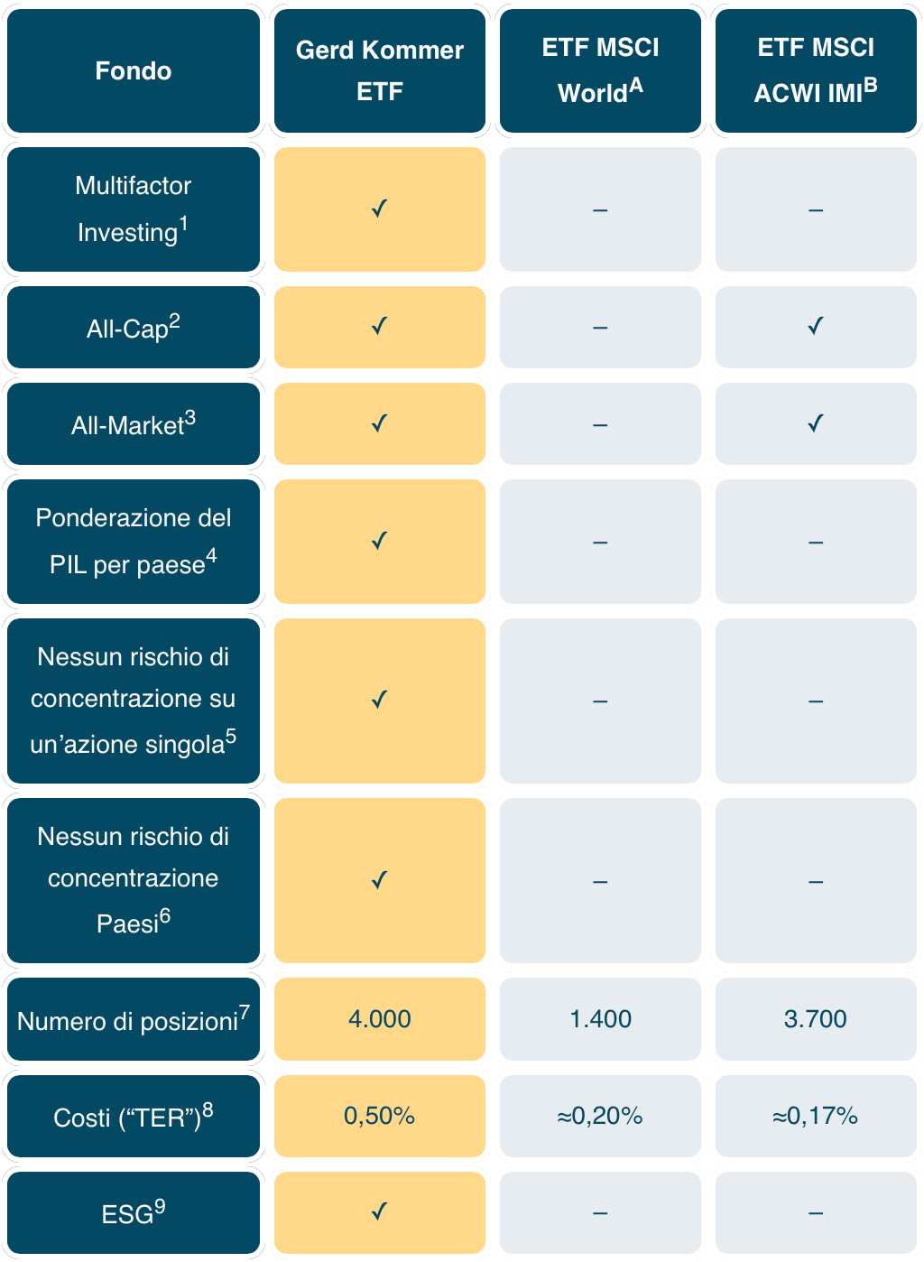 Nella tabella seguente, abbiamo confrontato il Gerd-Kommer-ETF con i più noti ETF standard del mercato azionario mondiale, ovvero gli ETF sull’MSCI World, sull’MSCI ACWI IMI e sul FTSE All-World. A tal fine abbiamo selezionato quelli che a nostro avviso sono i criteri più importanti per gli ETF azionari globali: