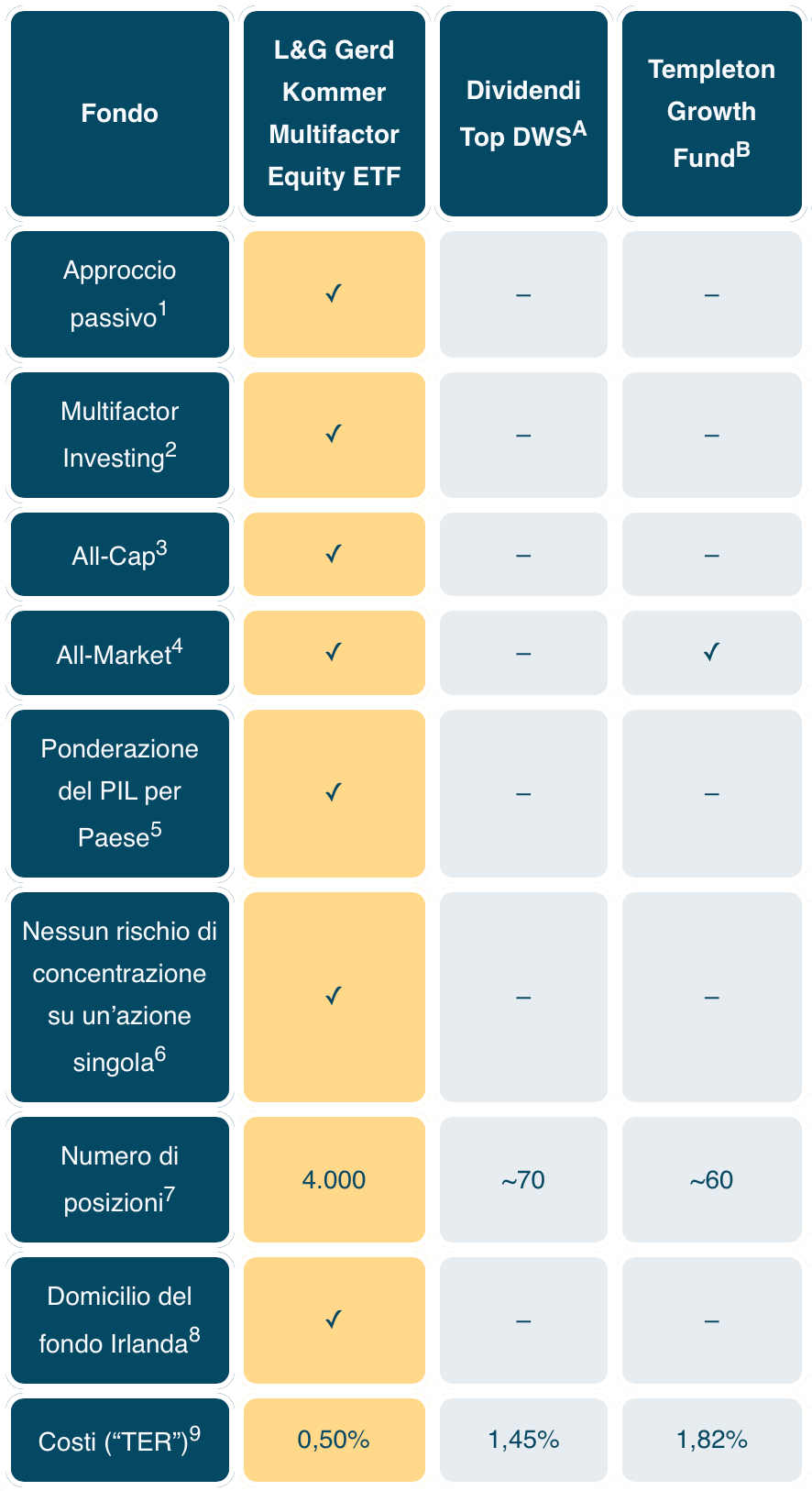 L’L&G Gerd Kommer Multifactor Equity UCITS ETF è la soluzione 1-ETF per la quota azionaria rischiosa del concetto di portafoglio globale di Gerd Kommer. Ciò lo pone in diretta concorrenza con altri ETF sulla “Welt-AG”, ovvero una partecipazione al capitale proprio altamente diversificata nella parte quotata in borsa dell’economia globale, come è possibile ad es. attraverso l’acquisto di un ETF su un indice MSCI World, MSCI ACWI o FTSE All-World.