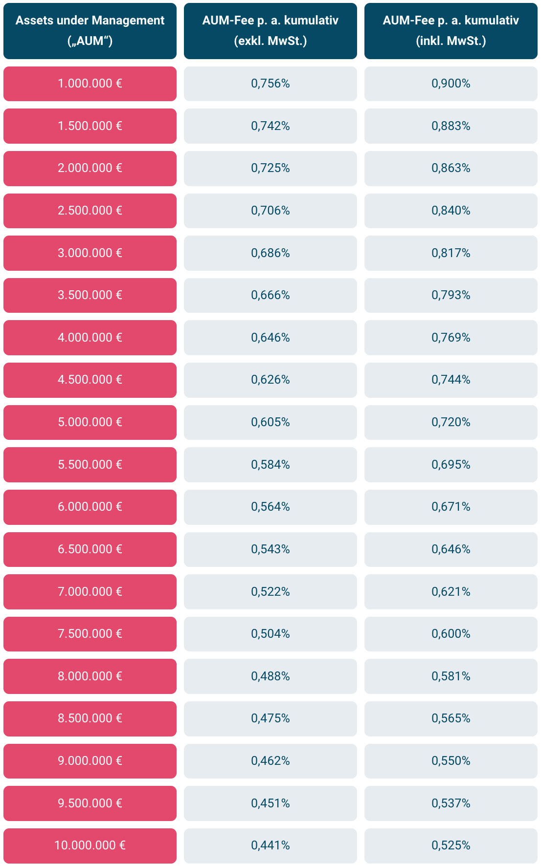 Die Werte in den Spalten „AUM-Fee p. a. kumulativ (inkl. MwSt.)“ und „AUM-Fee p. a. kumulativ (exkl. MwSt.)“ sind kaufmännisch gerundet und ergeben sich aus der Fee in Bezug auf die einzelnen Tranchen.